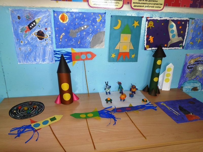 C 5 апреля по 12 апреля в саду проходила неделя космонавтики. С ребятами проводились беседы-презентации о планетах, орбитальных станциях и первых космонавтах, читали рассказы , заучивали стихи о космосе, отгадывали загадки, смотрели мультфильмы. Была организована выставка детских работ. В завершении недели состоялось спортивное развлечение «Юные космонавты».