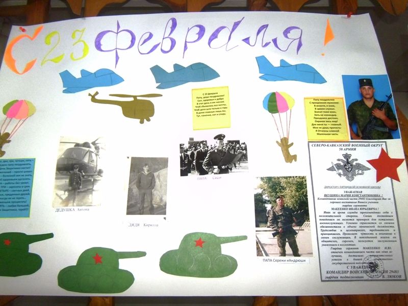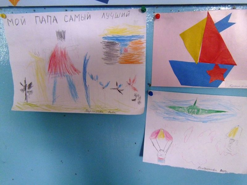 Ребята не только рисовали и делали поделки, но и помогали в оформлении поздравительной газеты для пап, дядей и дедушек, служивших в армии, принесли их фотографии.